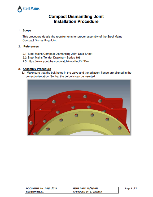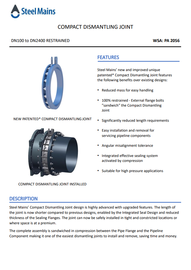 Steel Mains is now offering a new dismantling joint called The Compact Dismantling Joint. The new design is highly advanced with upgraded features, assisting with easier installation in confined areas due to its compact length and ease of installation.