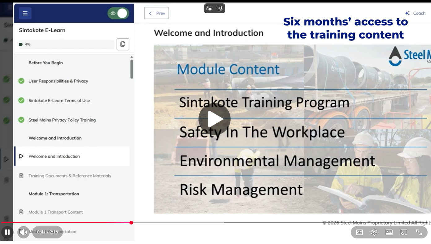Sintakote E-Learn is an online, self-paced course. Students learn through short videos followed by quizzes, hosted on Steel Mains learning management system (LMS). | | Sintakote Site Masterclass is an in-person, one-day workshop, delivered by a Steel Mains trainer. Steel Mains offers scheduled sessions at Steel Mains facilities and on-request for project-specific needs at suitable facilities. | | Our On-site Practical Assessment is a hands-on evaluation of skills to confirm participants can apply the theoretical knowledge to real-case scenarios on site.